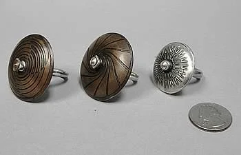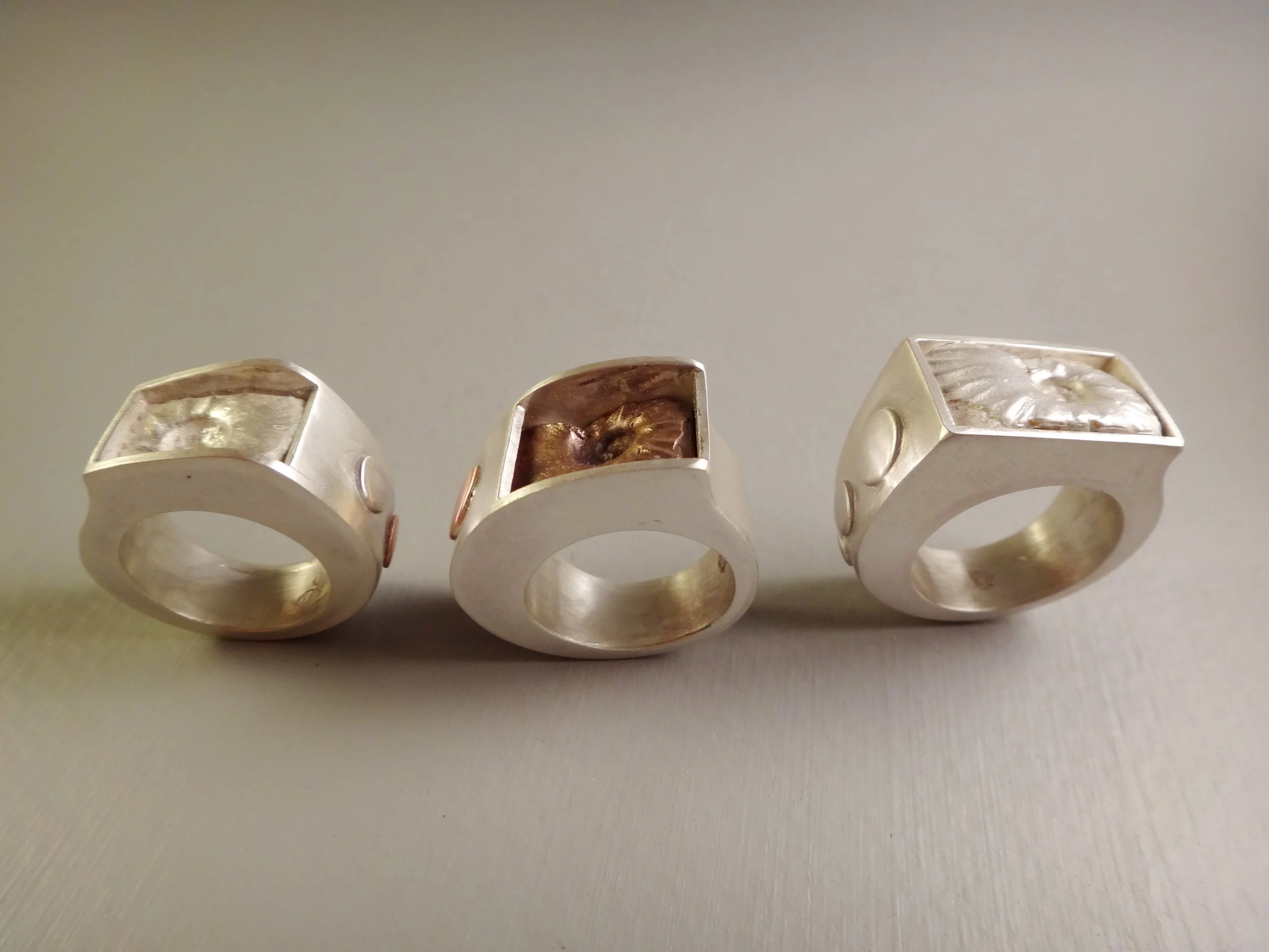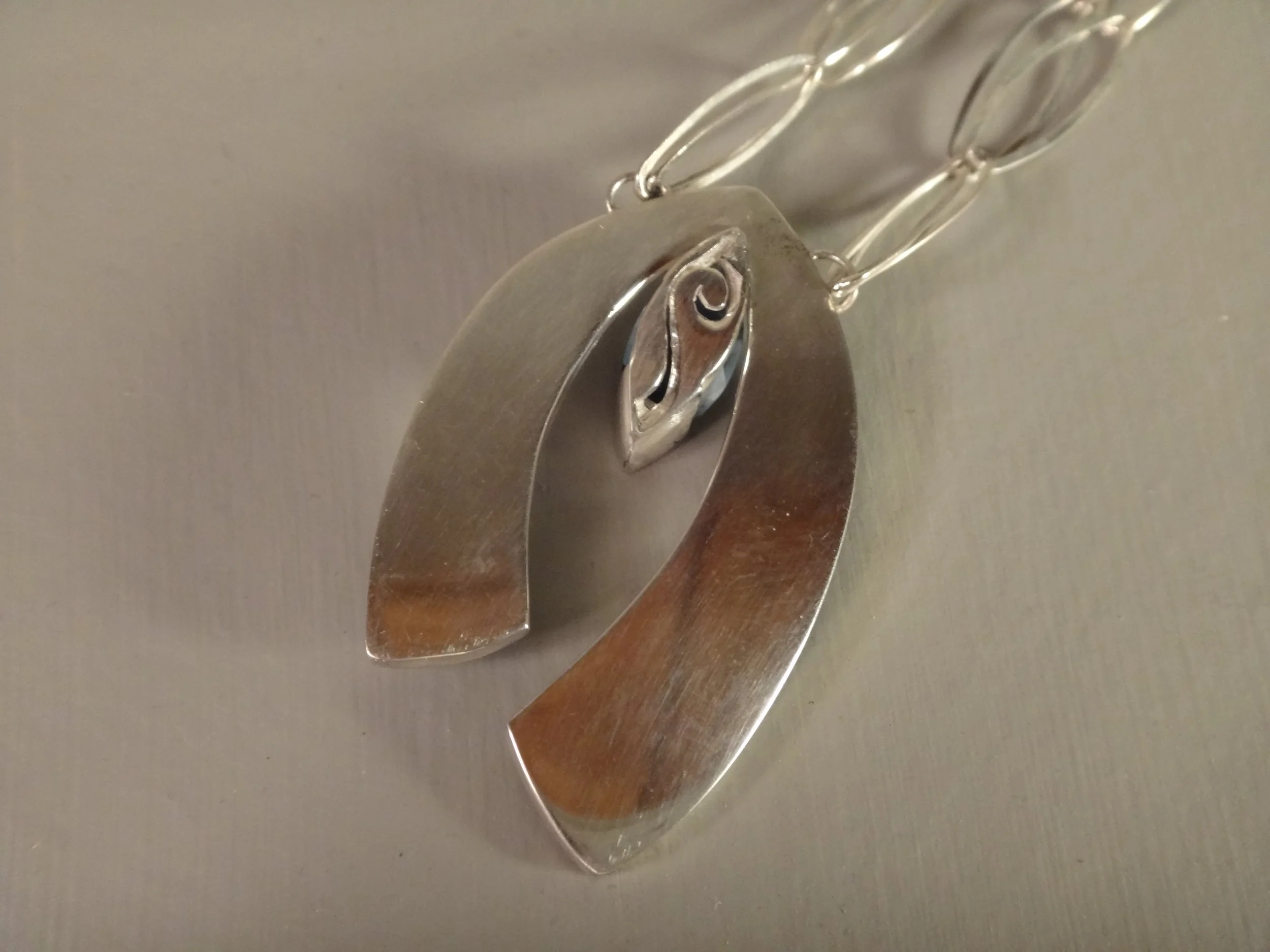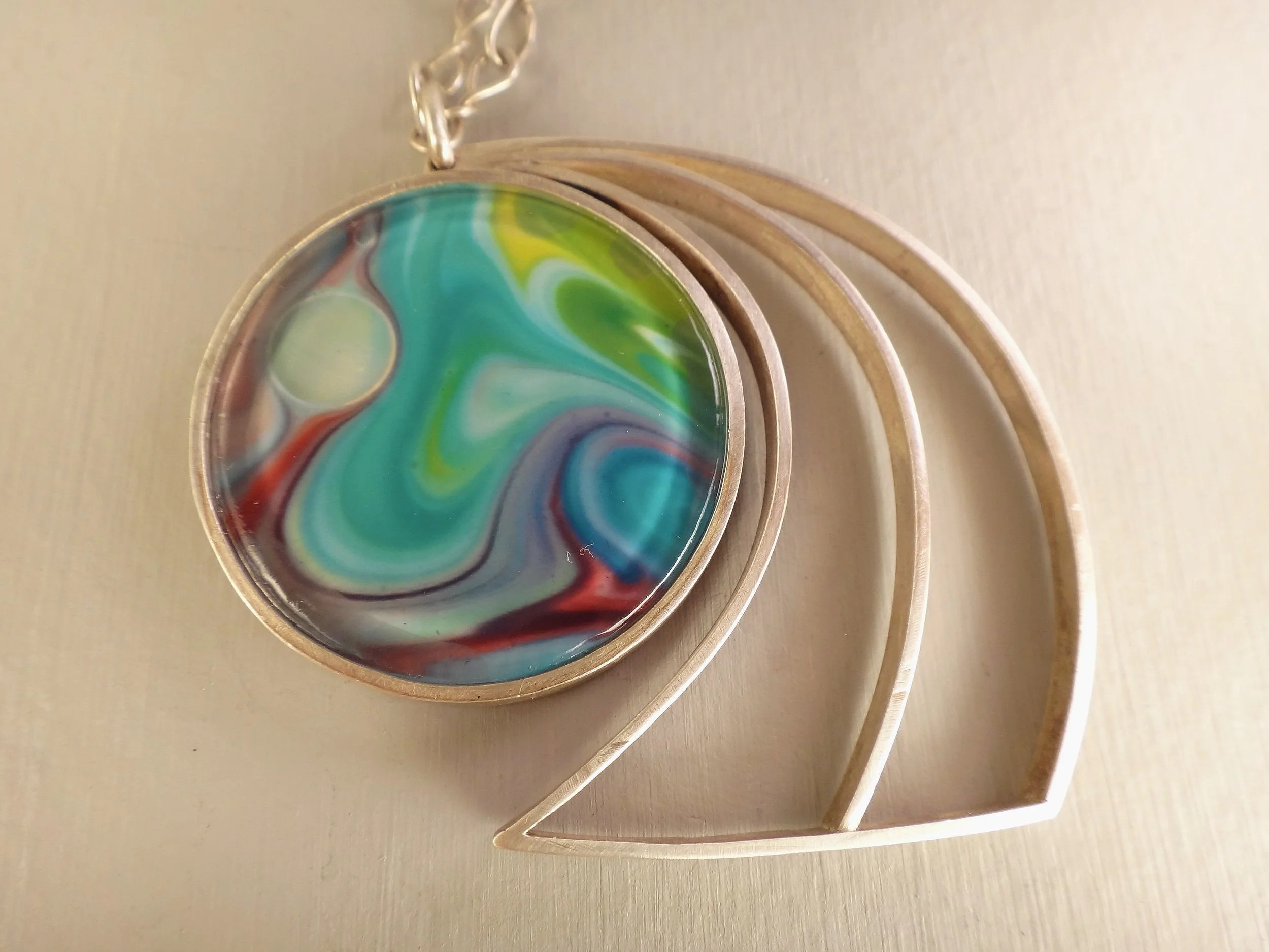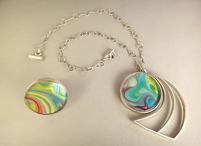 The swirls are made by a natural chemical reaction that happens when combining various liquid substances, then a photo is taken and framed in a sterling silver bezel.